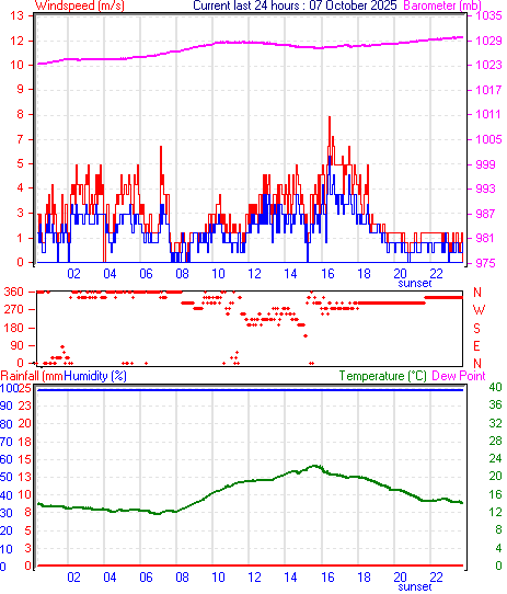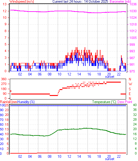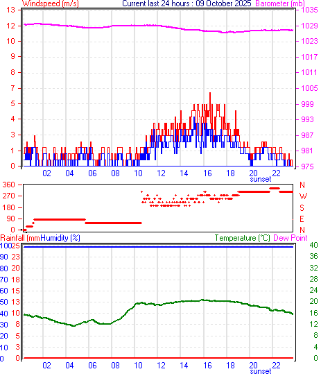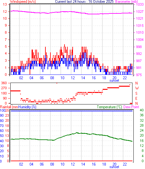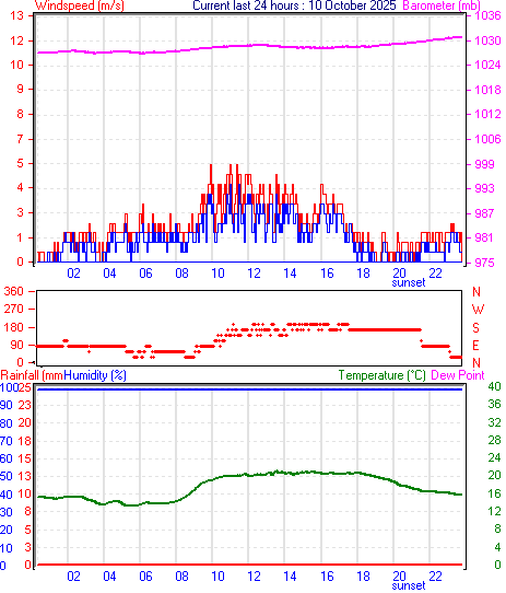 --------------------------------------------------- Average temperature 17.7 °C Average humidity 100 % Average dewpoint 17.7 °C Average barometer 1029.1 mb Average windspeed 1.1 m/s Average gustspeed 1.6 m/s Average direction 146 ° ( SE) Rainfall for month 4.8 mm Rainfall for year 356.0 mm ----------------------------------------------------------- Maximum rain per minute 0.0 mm on day 14 at time 00:02 Maximum temperature 21.3 °C on day 14 at time 16:36 Minimum temperature 13.7 °C on day 14 at time 07:37 Minimum pressure 1026.6 mb on day 14 at time 18:18 Maximum pressure 1030.1 mb on day 14 at time 10:42 Maximum windspeed 3.6 m/s from 186° on day 14 at time 14:03 Maximum gust speed 4.6 m/s from 199° on day 14 at time 15:10 Maximum humidity 100 % on day 14 at time 00:02 Minimum humidity 100 % on day 14 at time 00:02 Maximum heat index 18.0 °C on day 14 at time 21:36 Click here for todays 24 hour graph :14 :10 :2025 ------------------------------------------------------------ Averages\Extremes for day :15![]()