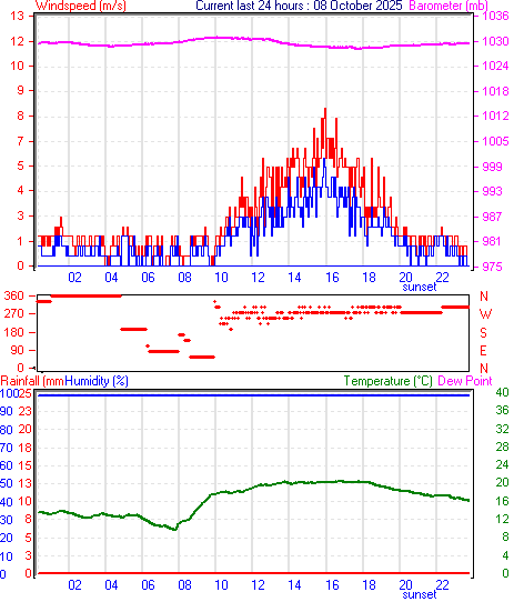 --------------------------------------------------- Average temperature 18.1 °C Average humidity 100 % Average dewpoint 18.1 °C Average barometer 1035.4 mb Average windspeed 1.1 m/s Average gustspeed 1.6 m/s Average direction 282 ° (WNW) Rainfall for month 4.6 mm Rainfall for year 355.8 mm ----------------------------------------------------------- Maximum rain per minute 0.2 mm on day 11 at time 05:35 Maximum temperature 21.7 °C on day 11 at time 10:53 Minimum temperature 14.1 °C on day 11 at time 06:49 Minimum pressure 1033.5 mb on day 11 at time 21:47 Maximum pressure 1036.1 mb on day 11 at time 11:04 Maximum windspeed 3.6 m/s from 235° on day 11 at time 15:49 Maximum gust speed 5.1 m/s from 276° on day 11 at time 15:52 Maximum humidity 100 % on day 11 at time 00:02 Minimum humidity 100 % on day 11 at time 00:02 Maximum heat index 18.0 °C on day 11 at time 21:03 Rain for the day :0.2 mm Click here for todays 24 hour graph :11 :10 :2025 ------------------------------------------------------------ Averages\Extremes for day :12![]()