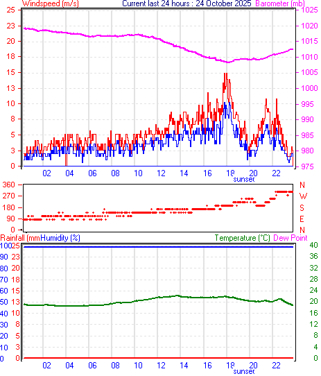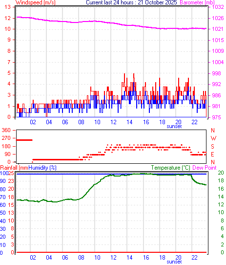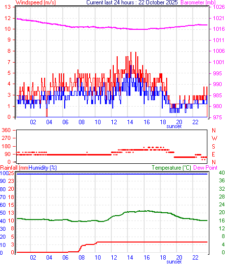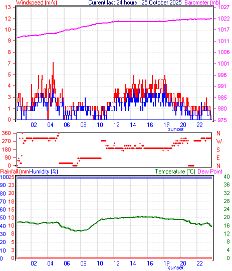 --------------------------------------------------- Average temperature 18.1 °C Average humidity 100 % Average dewpoint 18.1 °C Average barometer 1018.5 mb Average windspeed 2.0 m/s Average gustspeed 2.8 m/s Average direction 94 ° ( E ) Rainfall for month 8.0 mm Rainfall for year 359.2 mm ----------------------------------------------------------- Maximum rain per minute 0.0 mm on day 22 at time 00:02 Maximum temperature 21.1 °C on day 22 at time 16:58 Minimum temperature 15.2 °C on day 22 at time 06:24 Minimum pressure 1016.3 mb on day 22 at time 07:50 Maximum pressure 1019.3 mb on day 22 at time 00:02 Maximum windspeed 5.1 m/s from 134° on day 22 at time 15:39 Maximum gust speed 7.2 m/s from 125° on day 22 at time 15:18 Maximum humidity 100 % on day 22 at time 00:02 Minimum humidity 100 % on day 22 at time 00:02 Maximum heat index 18.0 °C on day 22 at time 11:19 Click here for todays 24 hour graph :22 :10 :2025 ------------------------------------------------------------ Averages\Extremes for day :23![]()
