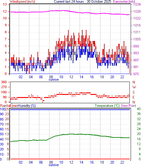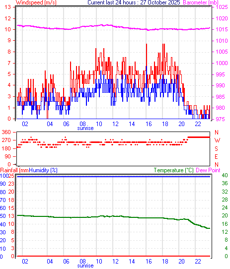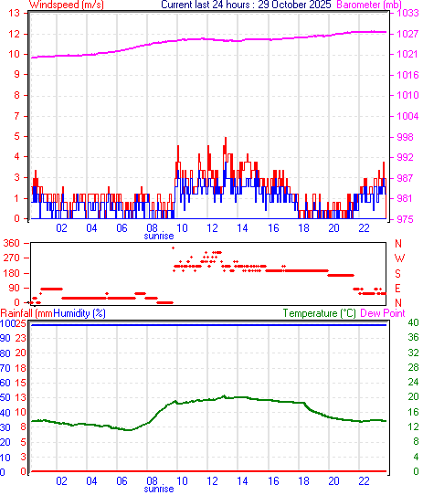--------------------------------------------------- Average temperature 15.2 °C Average humidity 100 % Average dewpoint 15.2 °C Average barometer 1019.6 mb Average windspeed 1.4 m/s Average gustspeed 2.1 m/s Average direction 146 ° ( SE) Rainfall for month 8.0 mm Rainfall for year 359.2 mm ----------------------------------------------------------- Maximum rain per minute 0.0 mm on day 27 at time 00:02 Maximum temperature 19.3 °C on day 27 at time 12:37 Minimum temperature 10.0 °C on day 27 at time 07:09 Minimum pressure 1015.9 mb on day 26 at time 00:44 Maximum pressure 1021.4 mb on day 27 at time 10:35 Maximum windspeed 4.6 m/s from 198° on day 27 at time 14:48 Maximum gust speed 6.2 m/s from 210° on day 27 at time 13:32 Maximum humidity 100 % on day 27 at time 00:02 Minimum humidity 100 % on day 27 at time 00:02 Maximum heat index 18.0 °C on day 27 at time 16:43 Click here for todays 24 hour graph :27 :10 :2025 ------------------------------------------------------------ Averages\Extremes for day :28![]()