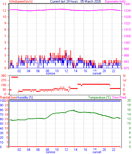 --------------------------------------------------- Average temperature 14.0 °C Average humidity 100 % Average dewpoint 14.0 °C Average barometer 1032.7 mb Average windspeed 1.2 m/s Average gustspeed 1.8 m/s Average direction 91 ° ( E ) Rainfall for month 0.0 mm Rainfall for year 271.6 mm ----------------------------------------------------------- Maximum rain per minute 0.0 mm on day 05 at time 00:02 Maximum temperature 18.5 °C on day 05 at time 12:20 Minimum temperature 11.1 °C on day 05 at time 07:06 Minimum pressure 1029.5 mb on day 05 at time 18:18 Maximum pressure 1034.5 mb on day 04 at time 00:17 Maximum windspeed 3.6 m/s from 182° on day 05 at time 14:23 Maximum gust speed 5.1 m/s from 165° on day 05 at time 13:03 Maximum humidity 100 % on day 05 at time 00:02 Minimum humidity 100 % on day 05 at time 00:02 Maximum heat index 18.0 °C on day 05 at time 12:13 Click here for todays 24 hour graph :5 :3 :2026 ------------------------------------------------------------ Averages\Extremes for day :06![]()