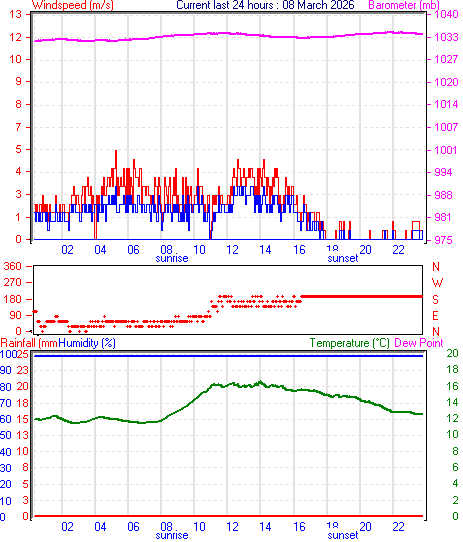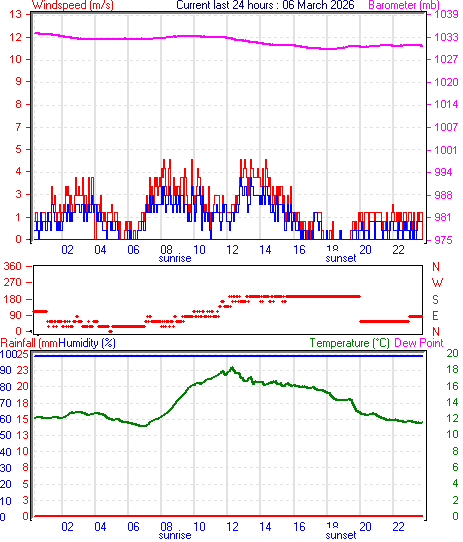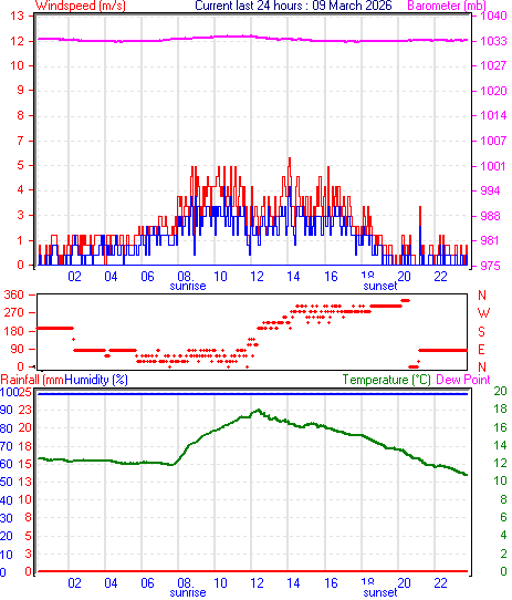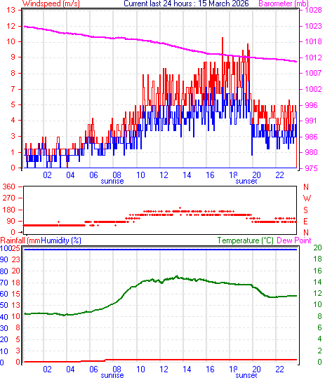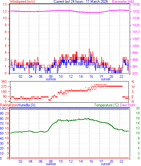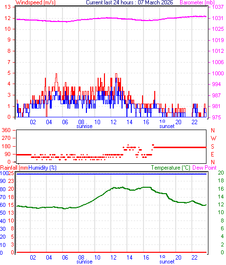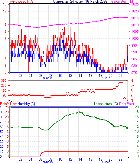 --------------------------------------------------- Average temperature 13.7 °C Average humidity 100 % Average dewpoint 13.7 °C Average barometer 1012.0 mb Average windspeed 2.5 m/s Average gustspeed 3.8 m/s Average direction 95 ° ( E ) Rainfall for month 37.6 mm Rainfall for year 309.2 mm ----------------------------------------------------------- Maximum rain per minute 0.2 mm on day 15 at time 07:17 Maximum temperature 18.2 °C on day 15 at time 14:06 Minimum temperature 10.6 °C on day 15 at time 07:42 Minimum pressure 1008.0 mb on day 15 at time 05:53 Maximum pressure 1015.7 mb on day 15 at time 21:58 Maximum windspeed 7.2 m/s from 071° on day 15 at time 12:18 Maximum gust speed 9.3 m/s from 074° on day 15 at time 11:16 Maximum humidity 100 % on day 15 at time 00:02 Minimum humidity 100 % on day 15 at time 00:02 Maximum heat index 18.0 °C on day 15 at time 14:13 Rain for the day :2.4 mm Click here for todays 24 hour graph :15 :3 :2026 ------------------------------------------------------------ Averages\Extremes for day :16![]()
