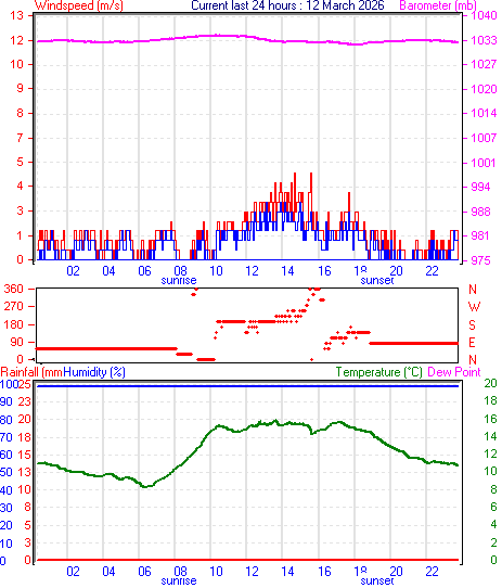 --------------------------------------------------- Average temperature 10.8 °C Average humidity 100 % Average dewpoint 10.8 °C Average barometer 1031.1 mb Average windspeed 1.8 m/s Average gustspeed 2.7 m/s Average direction 57 ° (ENE) Rainfall for month 34.8 mm Rainfall for year 306.4 mm ----------------------------------------------------------- Maximum rain per minute 1.0 mm on day 12 at time 09:21 Maximum temperature 12.2 °C on day 12 at time 06:16 Minimum temperature 8.8 °C on day 12 at time 00:02 Minimum pressure 1028.4 mb on day 12 at time 18:58 Maximum pressure 1033.0 mb on day 11 at time 00:04 Maximum windspeed 5.7 m/s from 034° on day 12 at time 18:53 Maximum gust speed 7.7 m/s from 034° on day 12 at time 18:53 Maximum humidity 100 % on day 12 at time 00:02 Minimum humidity 100 % on day 12 at time 00:02 Maximum heat index 12.2 °C on day 12 at time 06:16 Rain for the day :34.8 mm Click here for todays 24 hour graph :12 :3 :2026 ------------------------------------------------------------ Averages\Extremes for day :13![]()