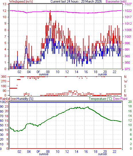 --------------------------------------------------- Average temperature 13.1 °C Average humidity 100 % Average dewpoint 13.1 °C Average barometer 1022.1 mb Average windspeed 2.7 m/s Average gustspeed 4.3 m/s Average direction 14 ° (NNE) Rainfall for month 37.6 mm Rainfall for year 309.2 mm ----------------------------------------------------------- Maximum rain per minute 0.0 mm on day 19 at time 00:02 Maximum temperature 17.9 °C on day 19 at time 16:48 Minimum temperature 7.3 °C on day 19 at time 02:09 Minimum pressure 1020.2 mb on day 19 at time 16:48 Maximum pressure 1022.5 mb on day 19 at time 23:42 Maximum windspeed 8.2 m/s from 012° on day 19 at time 08:50 Maximum gust speed 12.9 m/s from 06° on day 19 at time 09:28 Maximum humidity 100 % on day 19 at time 00:02 Minimum humidity 100 % on day 19 at time 00:02 Maximum heat index 17.9 °C on day 19 at time 16:48 Click here for todays 24 hour graph :19 :3 :2026 ------------------------------------------------------------ Averages\Extremes for day :20![]()