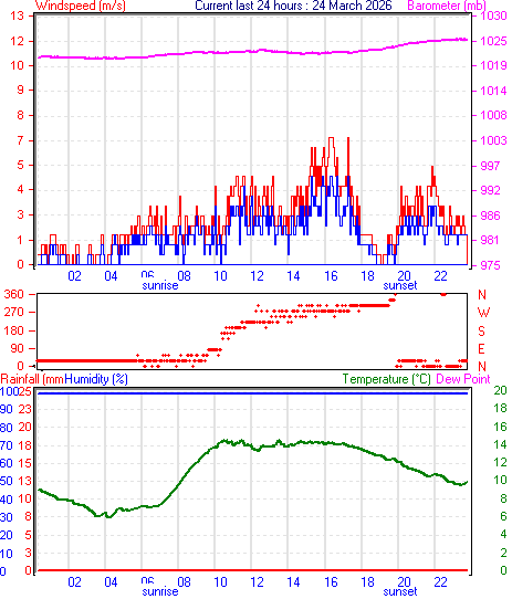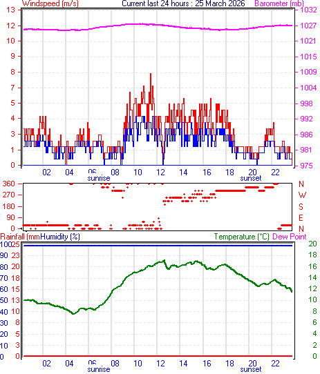 --------------------------------------------------- Average temperature 12.9 °C Average humidity 100 % Average dewpoint 12.9 °C Average barometer 1026.8 mb Average windspeed 1.8 m/s Average gustspeed 2.7 m/s Average direction 333 ° (NNW) Rainfall for month 40.6 mm Rainfall for year 312.2 mm ----------------------------------------------------------- Maximum rain per minute 0.0 mm on day 24 at time 00:02 Maximum temperature 17.2 °C on day 24 at time 12:39 Minimum temperature 7.5 °C on day 24 at time 04:42 Minimum pressure 1025.0 mb on day 24 at time 05:14 Maximum pressure 1027.5 mb on day 24 at time 10:29 Maximum windspeed 5.1 m/s from 033° on day 24 at time 10:42 Maximum gust speed 7.7 m/s from 08° on day 24 at time 11:27 Maximum humidity 100 % on day 24 at time 00:02 Minimum humidity 100 % on day 24 at time 00:02 Maximum heat index 17.2 °C on day 24 at time 12:39 Click here for todays 24 hour graph :24 :3 :2026 ------------------------------------------------------------ Averages\Extremes for day :25![]()