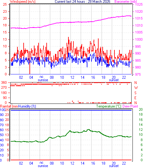 --------------------------------------------------- Average temperature 9.3 °C Average humidity 100 % Average dewpoint 9.3 °C Average barometer 1012.8 mb Average windspeed 4.7 m/s Average gustspeed 7.2 m/s Average direction 347 ° (NNW) Rainfall for month 41.6 mm Rainfall for year 313.2 mm ----------------------------------------------------------- Maximum rain per minute 0.0 mm on day 27 at time 00:02 Maximum temperature 12.2 °C on day 27 at time 15:31 Minimum temperature 7.1 °C on day 27 at time 06:20 Minimum pressure 1007.7 mb on day 27 at time 03:14 Maximum pressure 1017.0 mb on day 27 at time 23:37 Maximum windspeed 8.2 m/s from 01° on day 27 at time 16:15 Maximum gust speed 14.9 m/s from 357° on day 27 at time 11:44 Maximum humidity 100 % on day 27 at time 00:02 Minimum humidity 100 % on day 27 at time 00:02 Maximum heat index 12.2 °C on day 27 at time 15:31 Click here for todays 24 hour graph :27 :3 :2026 ------------------------------------------------------------ Averages\Extremes for day :28![]()