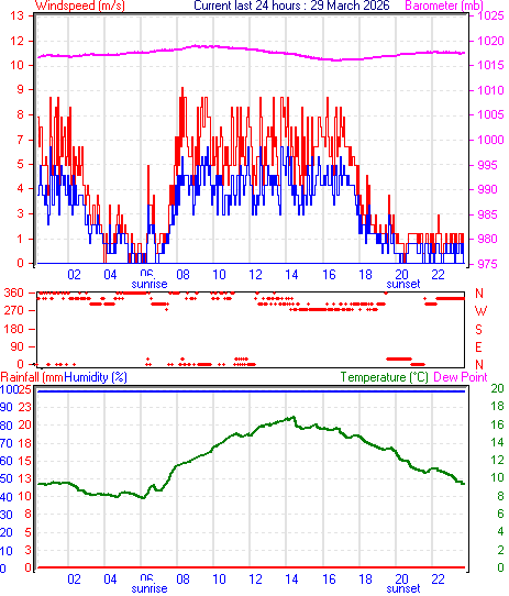 --------------------------------------------------- Average temperature 12.1 °C Average humidity 100 % Average dewpoint 12.1 °C Average barometer 1018.2 mb Average windspeed 2.7 m/s Average gustspeed 4.2 m/s Average direction 332 ° (NNW) Rainfall for month 41.6 mm Rainfall for year 313.2 mm ----------------------------------------------------------- Maximum rain per minute 0.0 mm on day 28 at time 00:02 Maximum temperature 17.0 °C on day 28 at time 14:27 Minimum temperature 7.7 °C on day 28 at time 06:08 Minimum pressure 1016.1 mb on day 28 at time 17:01 Maximum pressure 1019.1 mb on day 28 at time 09:26 Maximum windspeed 7.2 m/s from 013° on day 28 at time 08:17 Maximum gust speed 10.8 m/s from 013° on day 28 at time 08:17 Maximum humidity 100 % on day 28 at time 00:02 Minimum humidity 100 % on day 28 at time 00:02 Maximum heat index 17.0 °C on day 28 at time 14:27 Click here for todays 24 hour graph :28 :3 :2026 ------------------------------------------------------------ Averages\Extremes for day :29![]()
