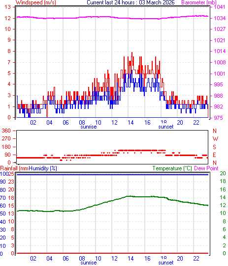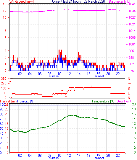 --------------------------------------------------- Average temperature 12.3 °C Average humidity 100 % Average dewpoint 12.3 °C Average barometer 1035.3 mb Average windspeed 2.0 m/s Average gustspeed 2.9 m/s Average direction 97 ° ( E ) Rainfall for month 0.0 mm Rainfall for year 271.6 mm ----------------------------------------------------------- Maximum rain per minute 0.0 mm on day 02 at time 00:02 Maximum temperature 14.4 °C on day 02 at time 14:27 Minimum temperature 10.4 °C on day 02 at time 04:10 Minimum pressure 1033.6 mb on day 02 at time 15:40 Maximum pressure 1035.6 mb on day 02 at time 23:16 Maximum windspeed 5.7 m/s from 124° on day 02 at time 15:17 Maximum gust speed 8.2 m/s from 124° on day 02 at time 15:17 Maximum humidity 100 % on day 02 at time 00:02 Minimum humidity 100 % on day 02 at time 00:02 Maximum heat index 14.4 °C on day 02 at time 14:27 Click here for todays 24 hour graph :2 :3 :2026 ------------------------------------------------------------ Averages\Extremes for day :03![]()
