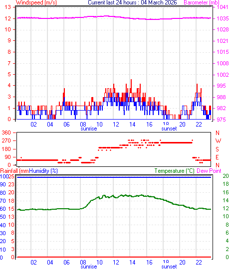 --------------------------------------------------- Average temperature 13.2 °C Average humidity 100 % Average dewpoint 13.2 °C Average barometer 1035.9 mb Average windspeed 1.1 m/s Average gustspeed 1.7 m/s Average direction 254 ° (WSW) Rainfall for month 0.0 mm Rainfall for year 271.6 mm ----------------------------------------------------------- Maximum rain per minute 0.0 mm on day 03 at time 00:02 Maximum temperature 15.4 °C on day 03 at time 15:28 Minimum temperature 11.6 °C on day 03 at time 01:17 Minimum pressure 1034.2 mb on day 03 at time 17:08 Maximum pressure 1036.3 mb on day 03 at time 11:18 Maximum windspeed 3.6 m/s from 194° on day 03 at time 12:03 Maximum gust speed 4.6 m/s from 057° on day 03 at time 22:10 Maximum humidity 100 % on day 03 at time 00:02 Minimum humidity 100 % on day 03 at time 00:02 Maximum heat index 15.4 °C on day 03 at time 15:28 Click here for todays 24 hour graph :3 :3 :2026 ------------------------------------------------------------ Averages\Extremes for day :04![]()